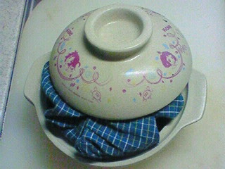顔を左に傾けて、ほっぺをとんとんたたきながらの食事です。