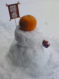 屋根に積もった雪で作ったぼこぼこの雪だるま・・・