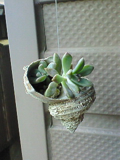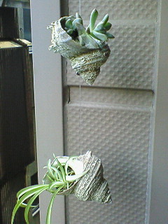 釣り糸で貝殻が四個繋がれ、多肉植物などが植えられています。