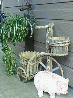 いつものブリキの鹿と、木のチャリを玄関先に出しました。